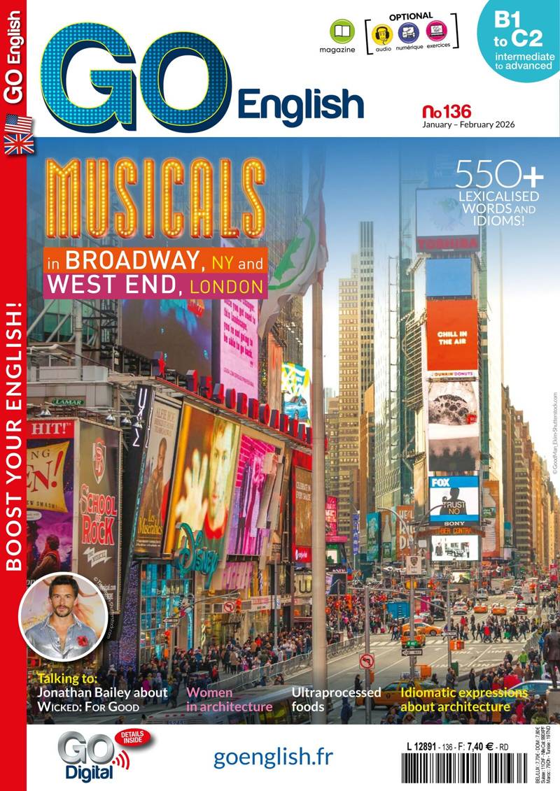 J'apprends l'anglais avec le magazine : Go English Le magazine Go English est adapté du niveau intermédiaire à avancé, pour ceux qui souhaitent progresser ou maintenir un bon niveau, et prendre du plaisir en découvrant la culture anglophone. Go English, c'est un ensemble de rubriques variées et approfondies (News, Language, Travel, Lifestyle, People et business), spécifiquement rédigées par des anglo-saxons spécialisés dans l'apprentissage de l'anglais. Vous apprendrez à l'aide de ce magazine plus vite avec un lexique pour mieux comprendre et un ensemble de quiz et d'exercices pour valider vos acquis. En plus, chaque article du magazine indique le niveau et le pays anglophone concerné (USA, GB, Australie, Nouvelle-Zélande...). Et surtout, vous améliorerez votre compréhension, votre intonation et votre prononciation avec le CD audio (60 minutes) lu par des anglo-saxons aux accents différents. Vous avez un niveau de difficulté important en anglais ? Profitez également des exercices interactifs gratuits sur le site internet www.goenglish.fr : lisez, écoutez, faites les exercices et découvrez votre performance. Découvrez aussi la version kids : Go English Kids Go English Kids permettra à votre enfant d'apprendre l'anglais tout en s'amusant. Go English ou vocable anglais ? Les 2 magazines ont un seul et unique but: vous aider à apprendre et perfectionner votre anglais.